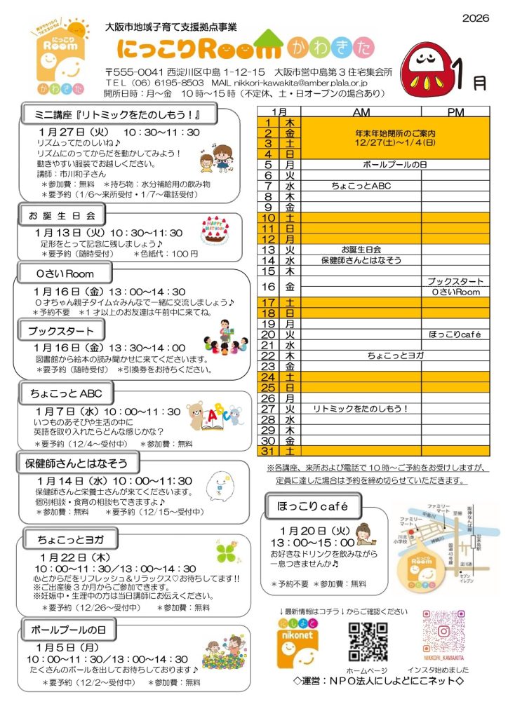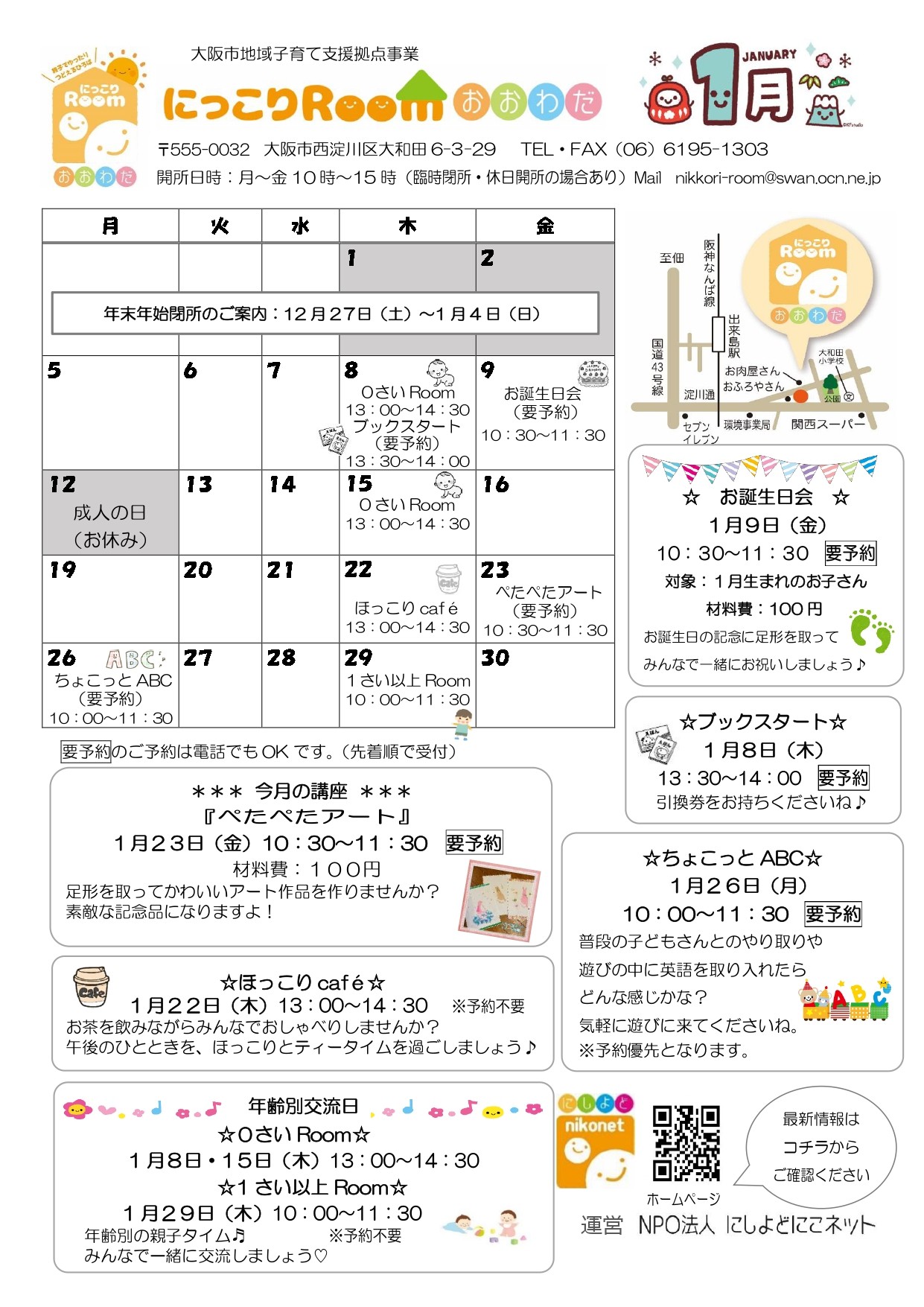 【にっこりRoom】1月のチラシのご案内 今年もクリスマスが終わり、1年がもうすぐ終わりますね。 どのような1年になりましたでしょうか? 1月のチラシを送ります。 1月は5日(月)からにっこりRoomは開いています。 来年もたくさん遊びに来てくださいね~♪ ではみなさんよいお年をお迎えください😄