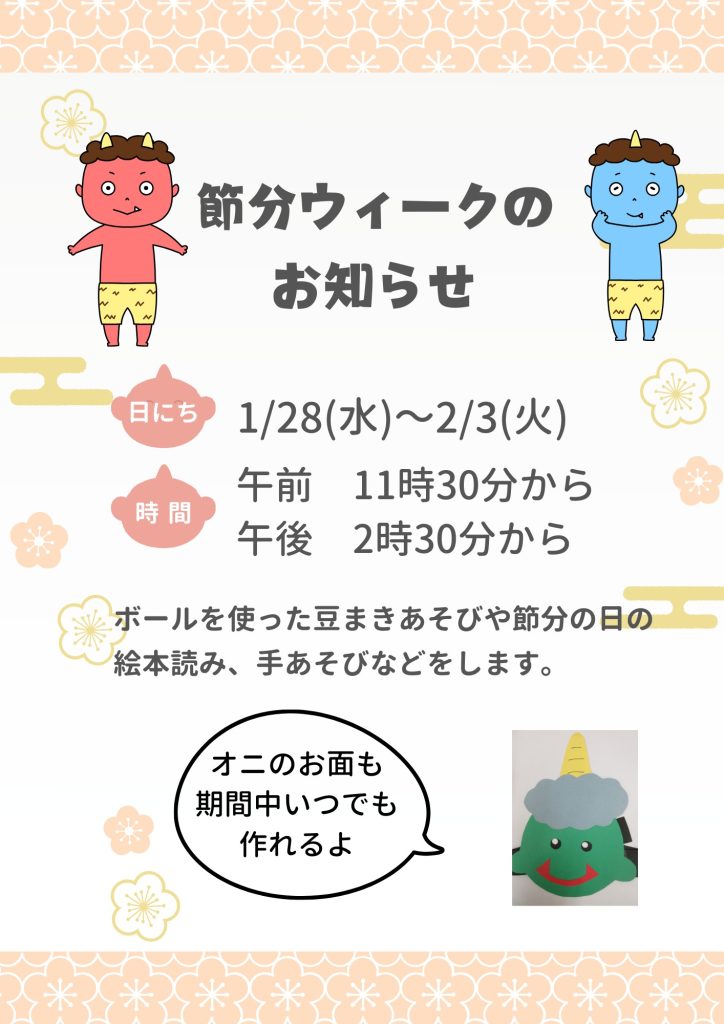お知らせ NPO法人 にしよど にこネット > お知らせ > 【にっこりRoomおおわだ】節分ウィークのお知らせ 【にっこりRoomおおわだ】節分ウィークのお知らせ にっこりRoomおおわだでは、節分ウィークをします🌸 ★開催期間 1月28日(水)~2月3日(火) ★時間 ・午前:11時30分から ・午後:2時30分から ボールを使った豆まきあそびや節分の日の絵本読み、手あそびなどをします。 お面も期間中いつでも作れますよ♪ ぜひ遊びに来てくださいね~☺️ ※ただし、29日(木)の午前は1さい以上Roomのため1さい以上のお子さんのみの来所になります。 ■地図 ←前の記事へ 一覧を見る