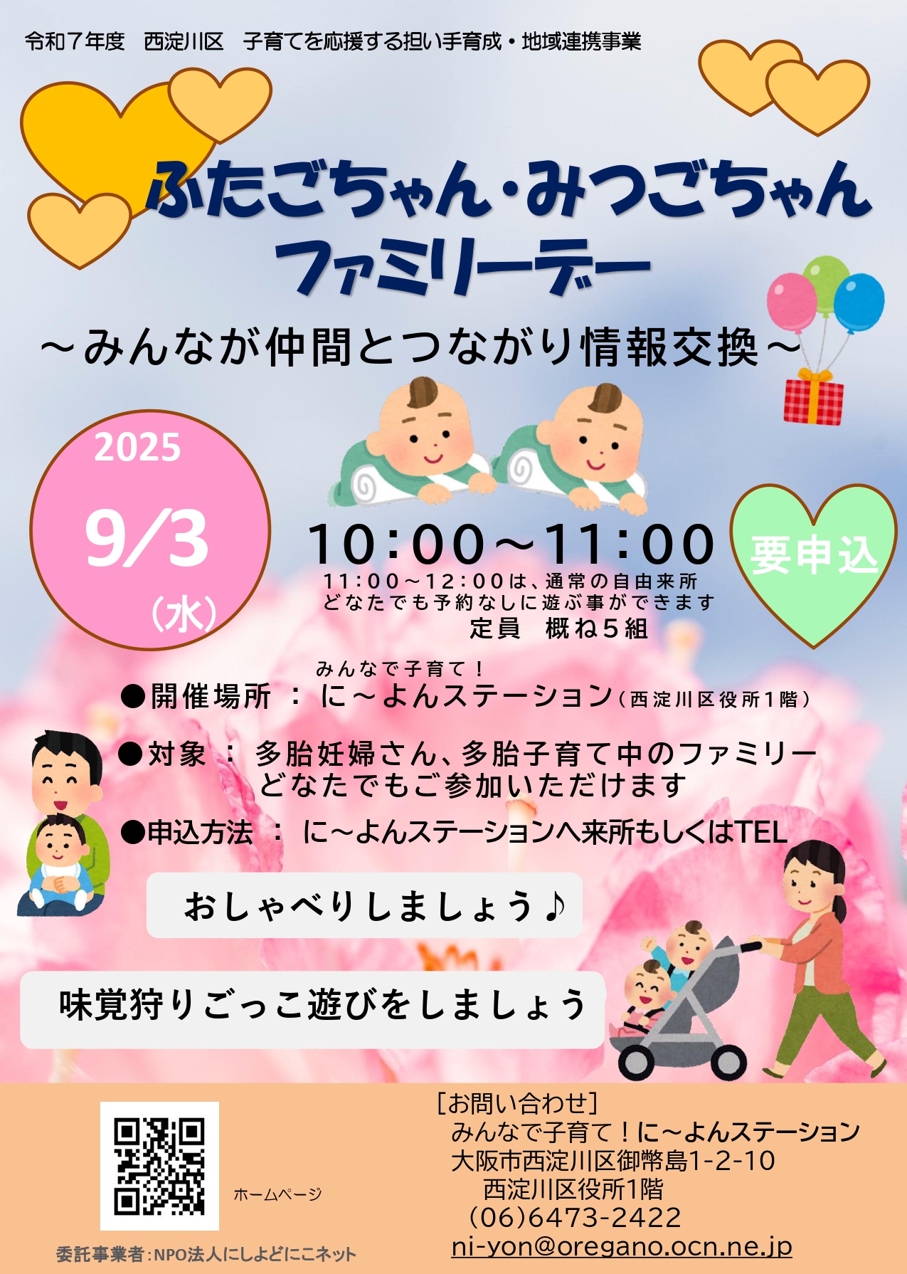 お知らせ NPO法人 にしよど にこネット > お知らせ > 【に~よんステーション】ふたごちゃん、みつごちゃん、ファミリーデー 【に~よんステーション】ふたごちゃん、みつごちゃん、ファミリーデー ←前の記事へ 次の記事へ→ 一覧を見る